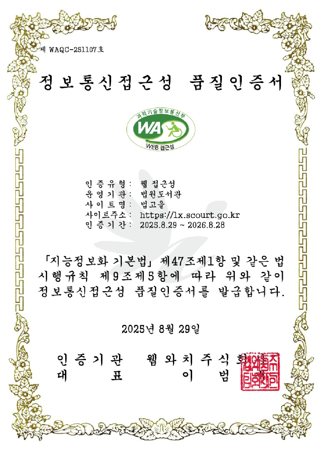 법원도서관 홈페이지가 획득한 품질인증마크를 소개합니다